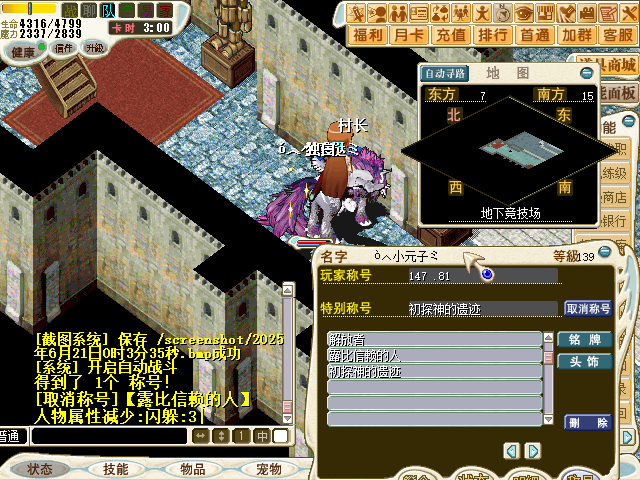 战斗完之后直接传送到村长家,然后和村长对话,得到1个称号。:“初入神的遗迹”